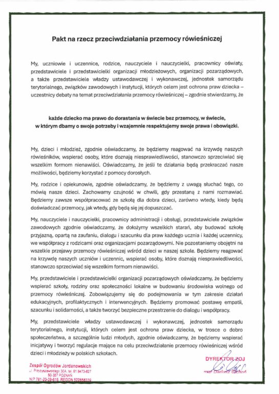 - Każdy wychowanek musi bezwzględnie przestrzegać zakazu: używania przemocy, a także zażywania, wnoszenia i posiadania na terenie Ogrodu Jordanowskiego Nr 2 środków psychoaktywnych, alkoholu i papierosów.